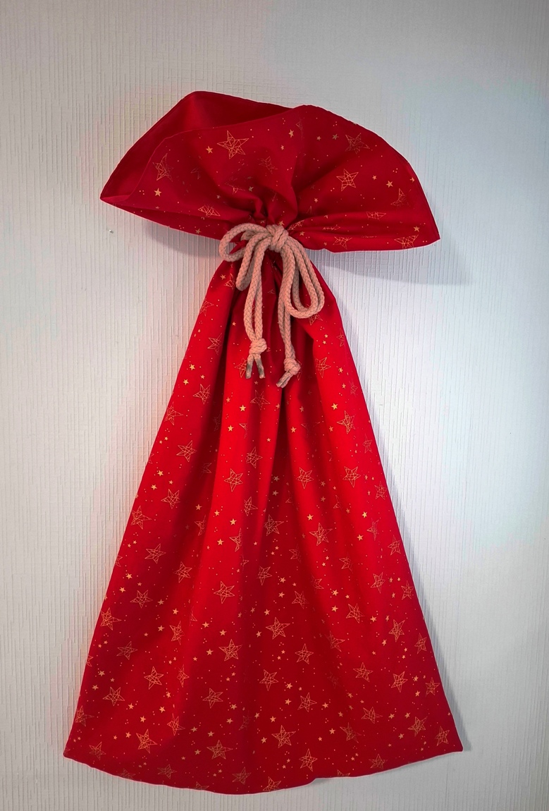 Sparen Sie sich unnötige Papierberge und nutzen Sie alle Jahre wieder diesen schönen und praktischen Geschenkesack. 100% Baumwollstoff, gefüttert und mit Baumwollkordel zum Schließen