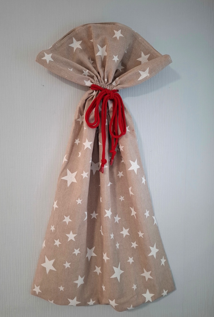 Sparen Sie sich unnötige Papierberge und nutzen Sie alle Jahre wieder diesen schönen und praktischen Geschenkesack. 100% Baumwollstoff, gefüttert und mit Baumwollkordel zum Schließen